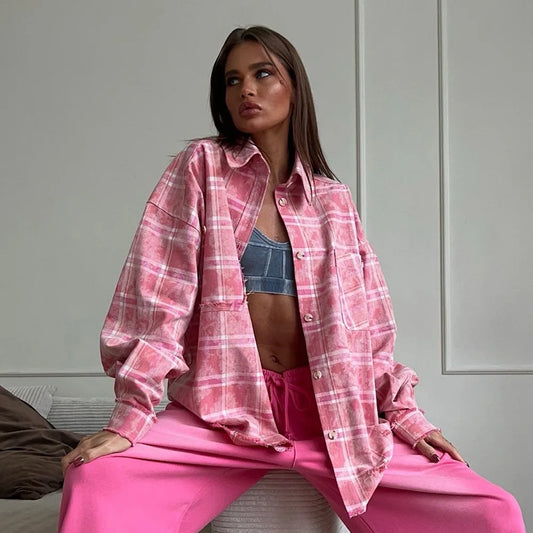 Camisa Oversized Xadrez Rosa com Efeito Lavado