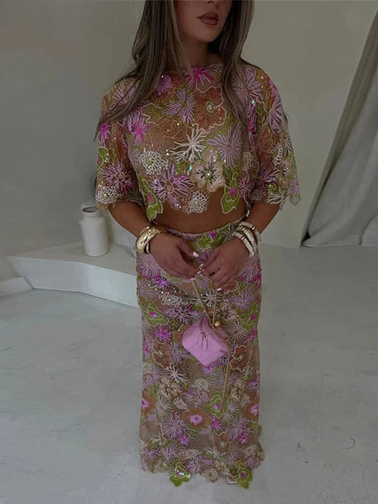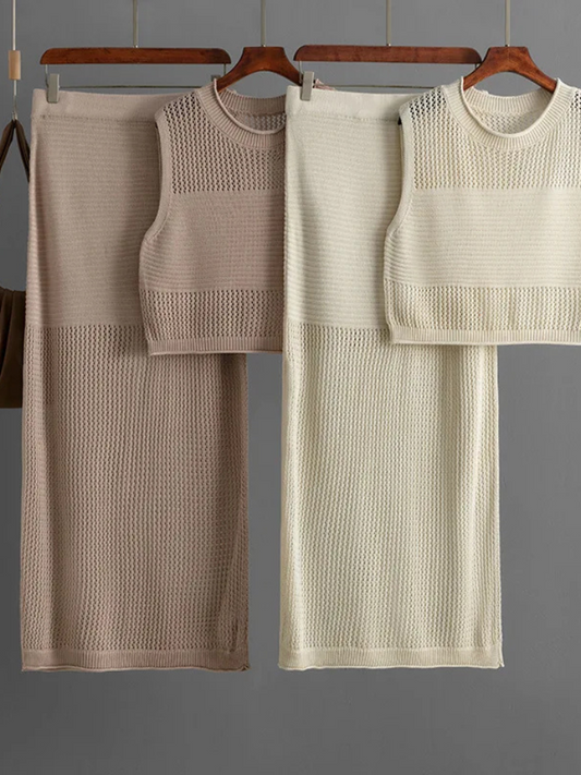 Conjunto Tricô Vazado Cropped + Saia Longa