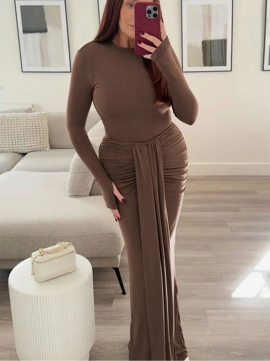 Vestido Longo Vinho com Gola Alta e Drapeado Lateral