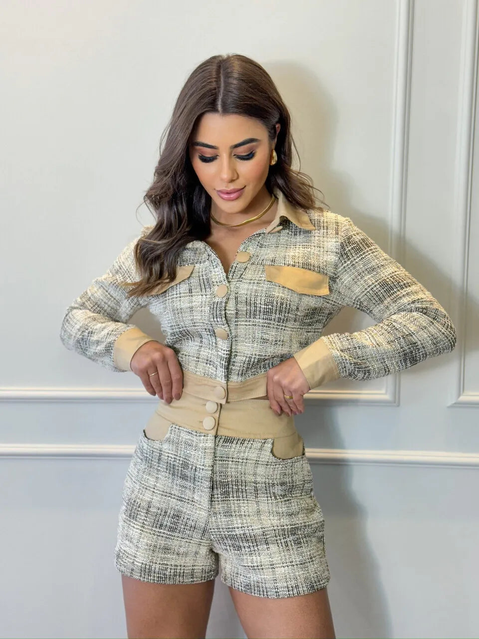 O Conjunto Anise é a perfeita união entre charme atemporal e sofisticação contemporânea. Com padronagem xadrez refinada e corte de alfaiataria impecável, a combinação entre cropped de manga longa e short de cintura alta valoriza a silhueta com elegância. Ideal para mulheres que amam um visual fashionista com toque clássico.
