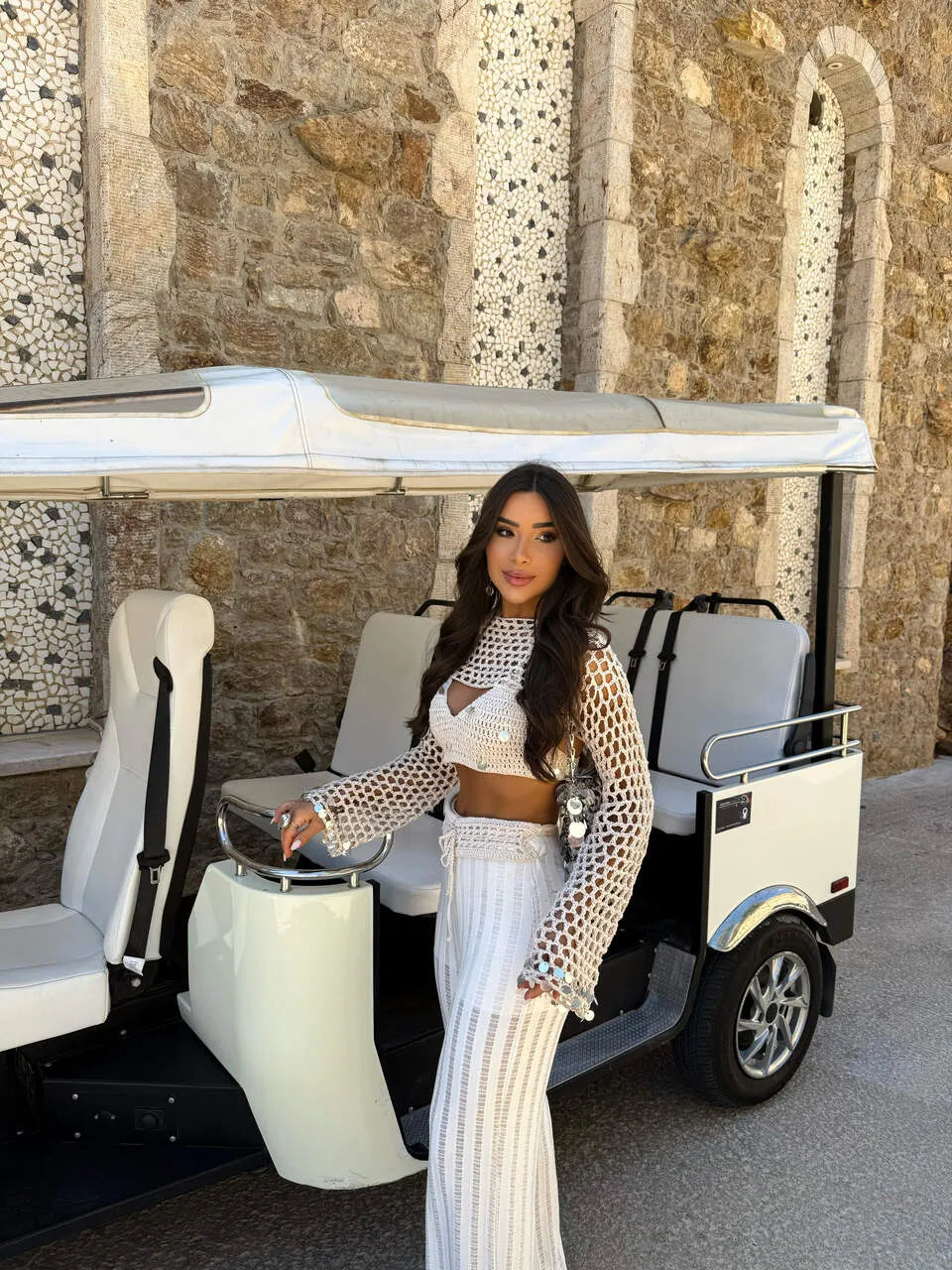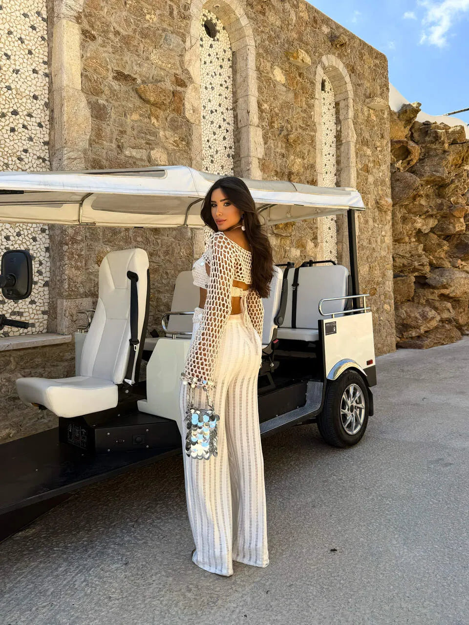 Conjunto Aurora Tricô Artesanal com Top Vazado e Calça Flare Leve