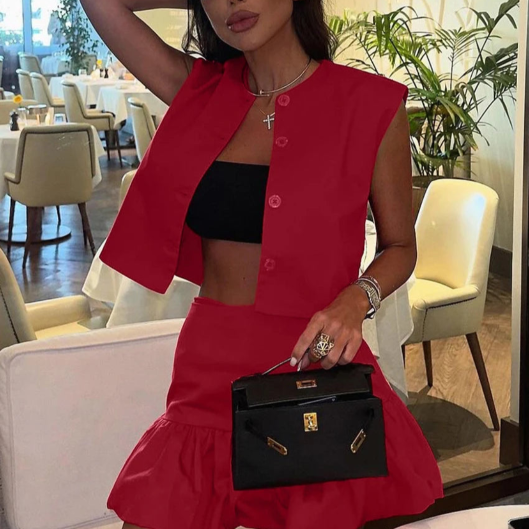 O Conjunto Colete & Saia Babado entrega um visual urbano–chic com pegada de alfaiataria. O colete cropped sem mangas tem decote redondo e fechamento frontal por botões, enquanto a saia curta de cintura alta traz babado franzido na barra para movimento e feminilidade. Perfeito para almoços, date nights e eventos casuais elegantes. Disponível em azul-marinho e vermelho.