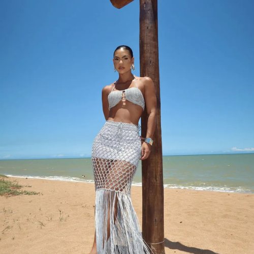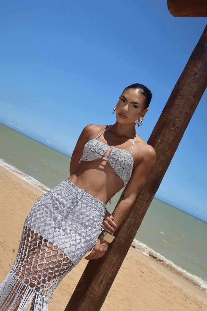O Conjunto Croche San Andres traz toda a bossa do litoral com um toque de glamour, perfeito para quem quer brilhar à beira-mar. O top em crochê valorizando o colo, somado à saia com franjas alongadas em efeito rede, cria um visual leve, sensual e super sofisticado, ideal para dias de sol e pôr do sol à beira da praia ou piscina.