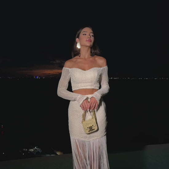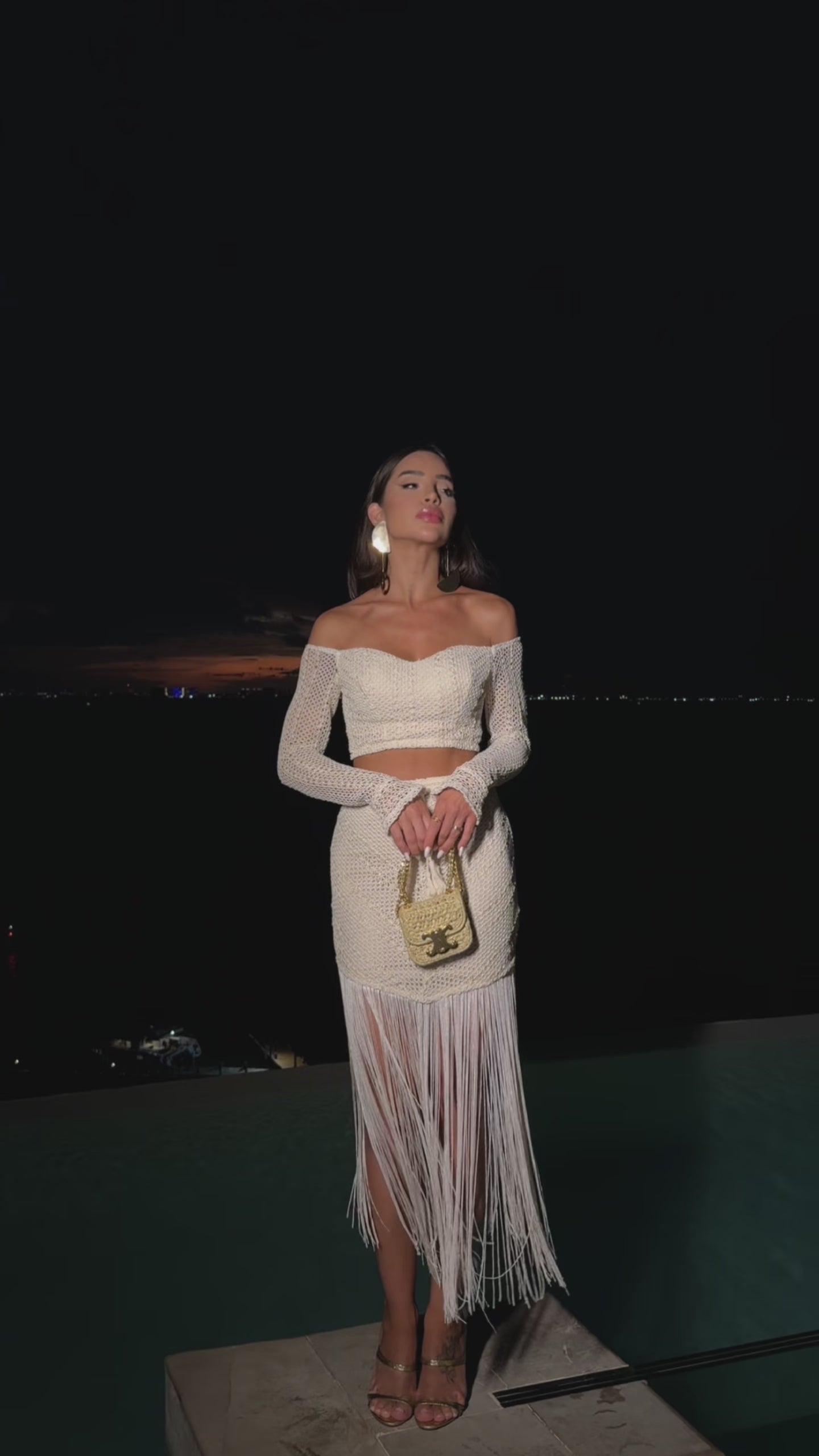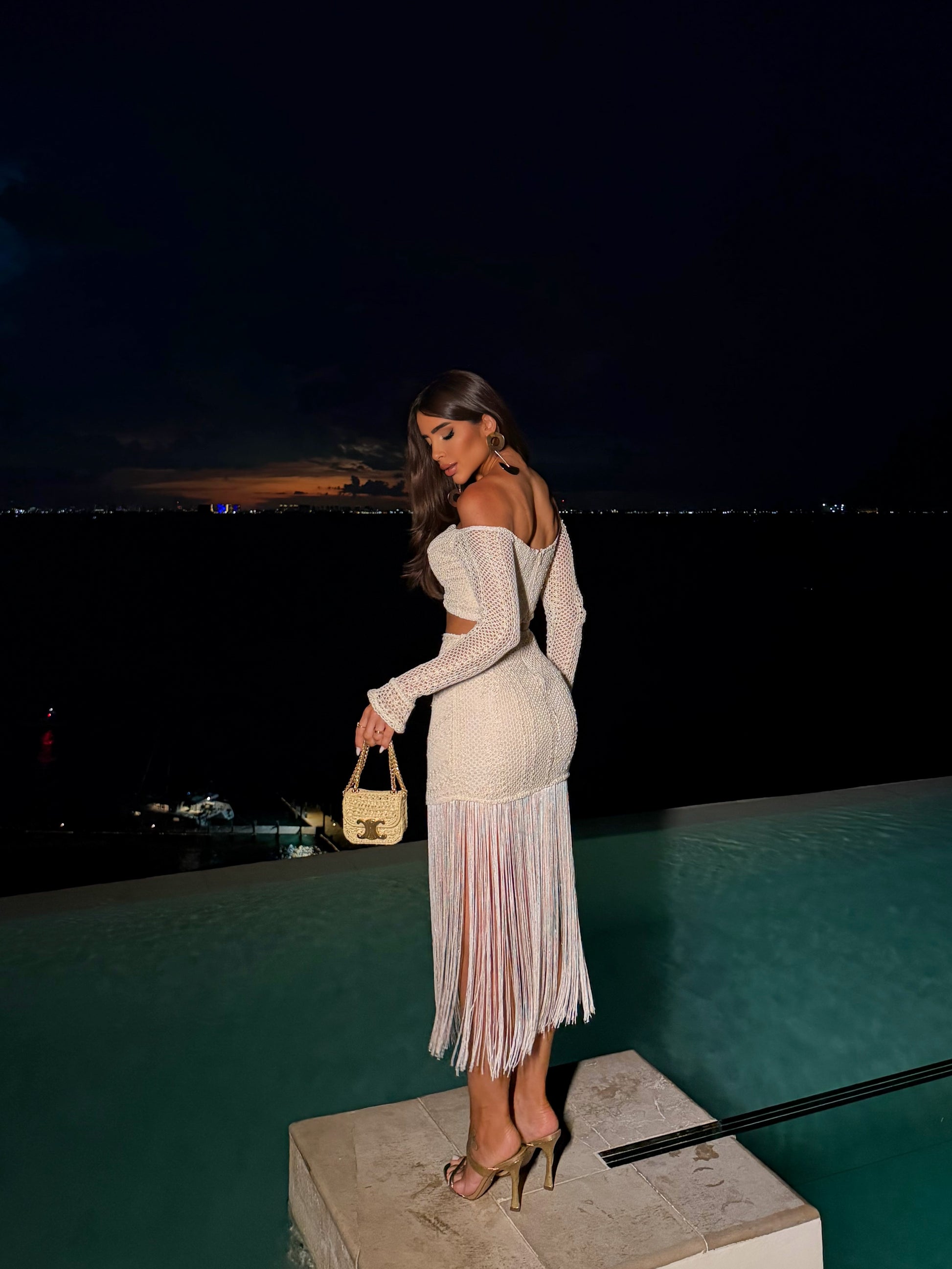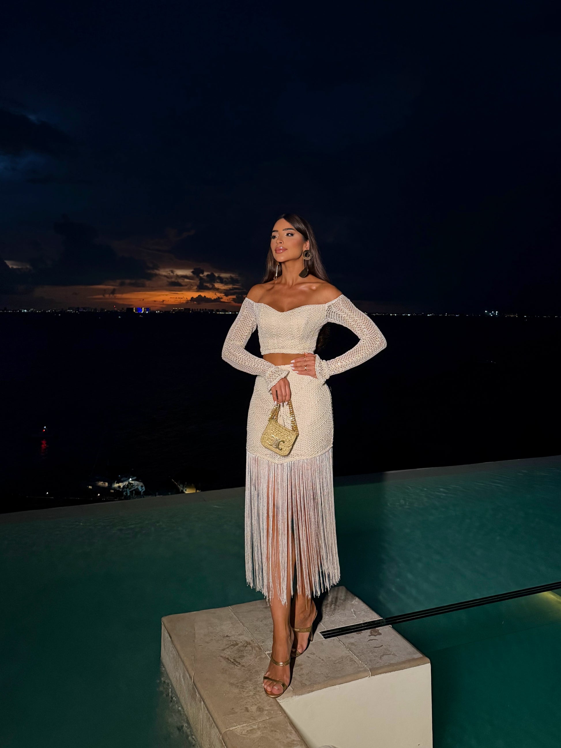 Ideal para quem deseja impressionar, o conjunto apresenta textura elegante em tricô leve, que destaca o corpo com naturalidade, enquanto as franjas longas garantem dramaticidade e charme em cada passo. Um look pensado para noites especiais, à beira-mar ou em eventos exclusivos.
