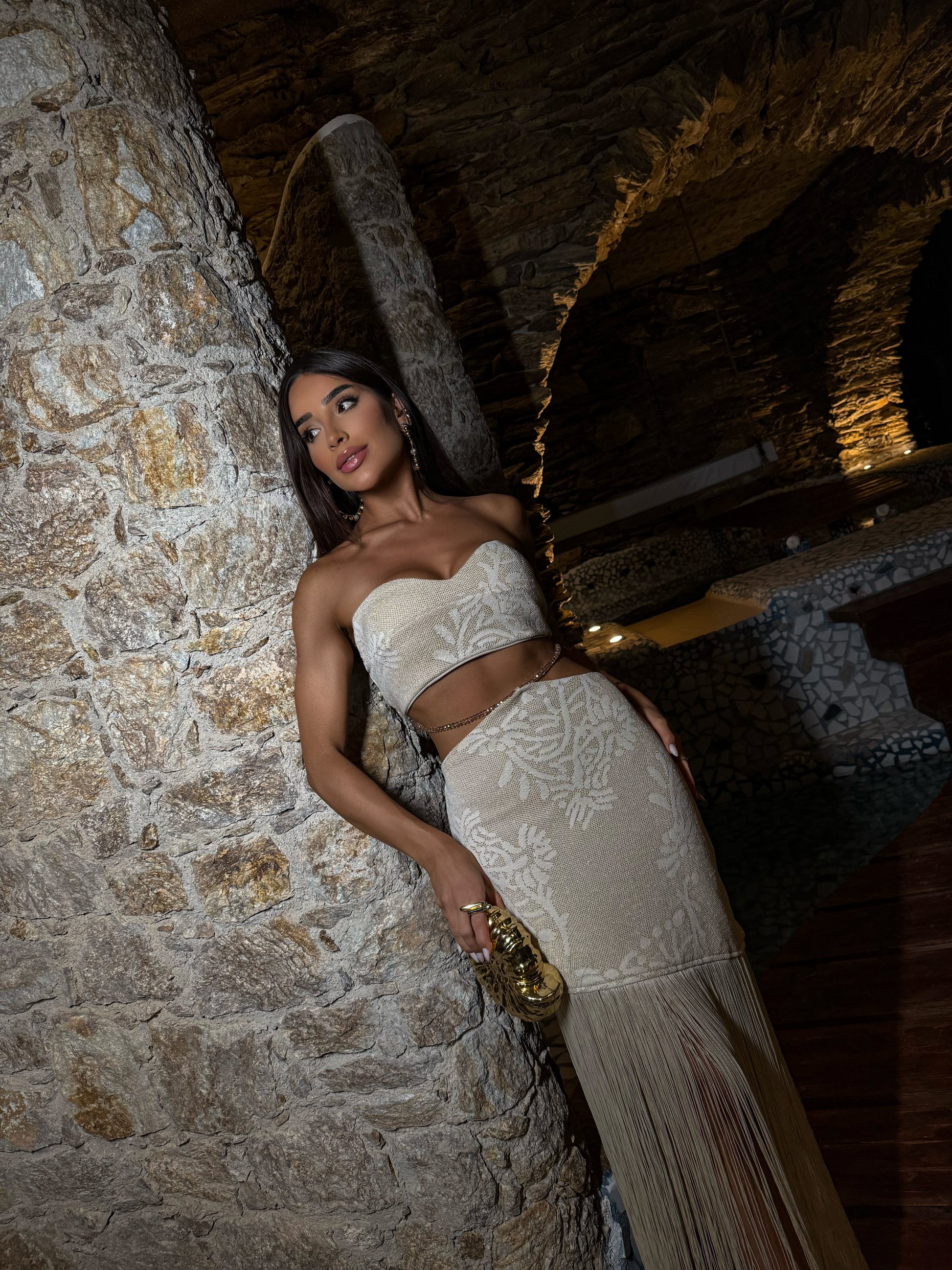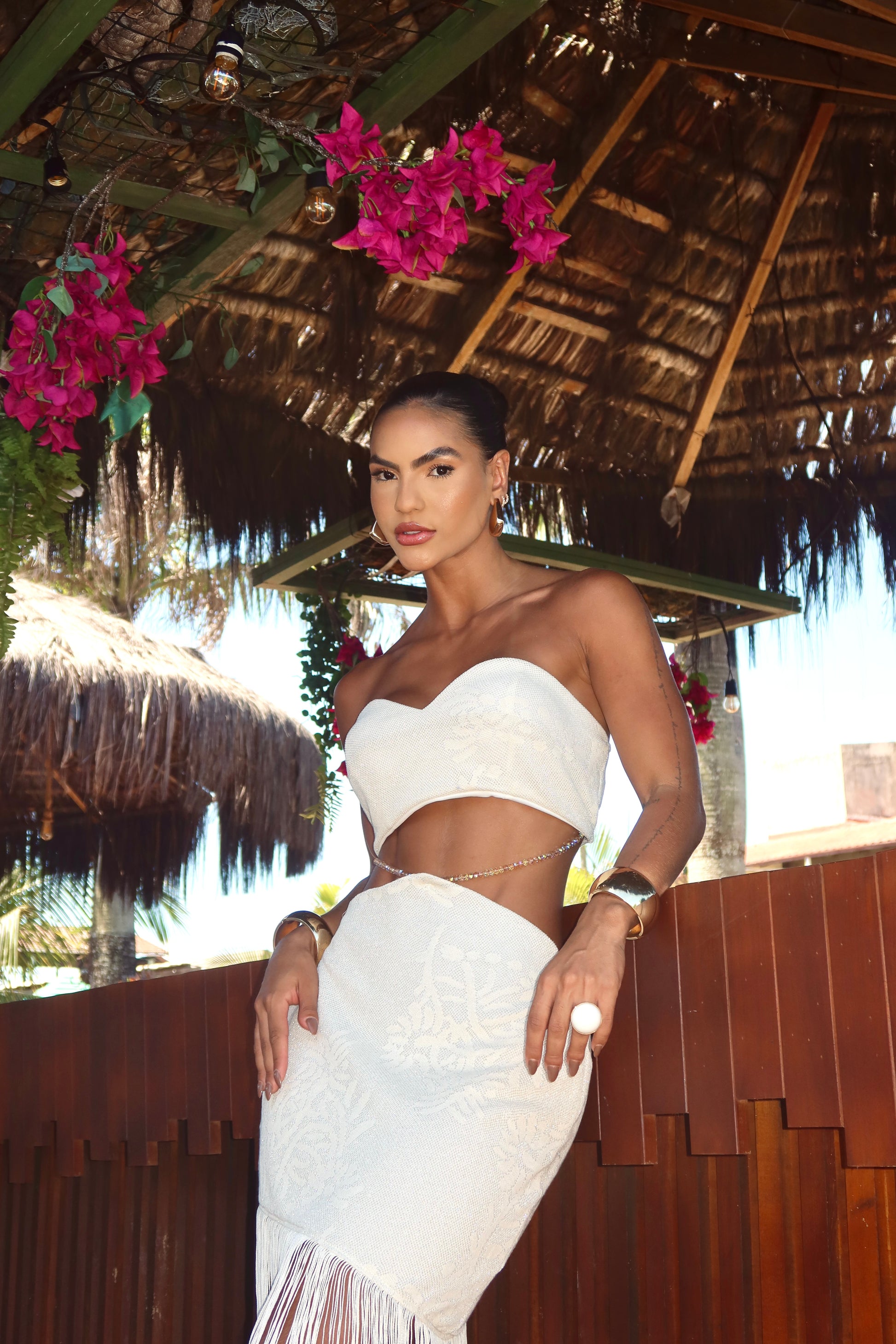 Perfeito para sunsets, férias em destinos paradisíacos e eventos à beira-mar, o conjunto traz um caimento impecável e uma estética marcante, com franjas longas que criam fluidez a cada passo e um top estruturado que realça o colo com naturalidade. Uma peça de impacto para mulheres que desejam brilhar com estilo e personalidade.