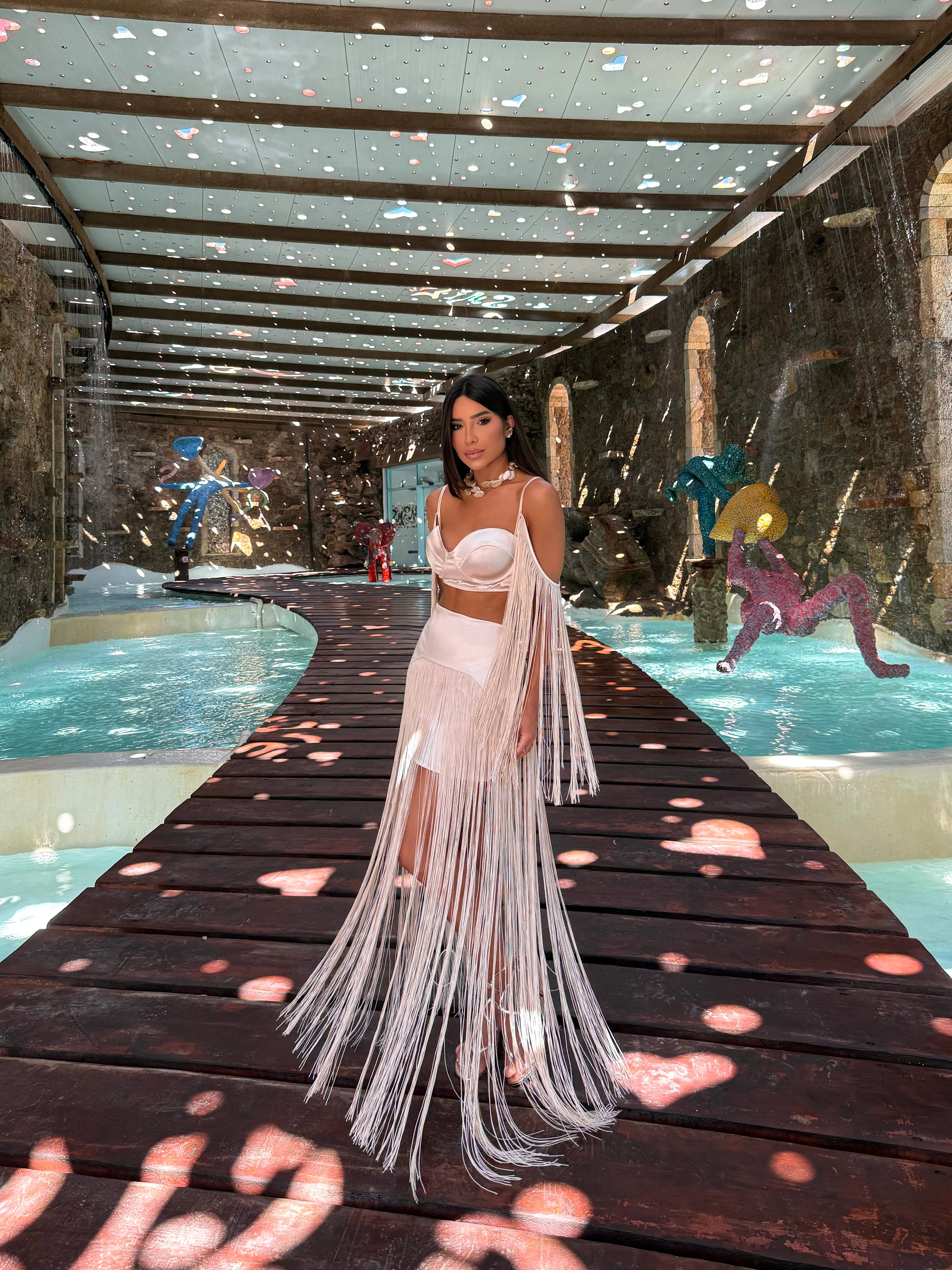Um look pensado para mulheres que amam protagonismo: o brilho acetinado, as franjas que acompanham o caminhar e a modelagem esculpida no corpo fazem deste conjunto a escolha perfeita para festas, jantares especiais, eventos noturnos e celebrações à beira-mar.