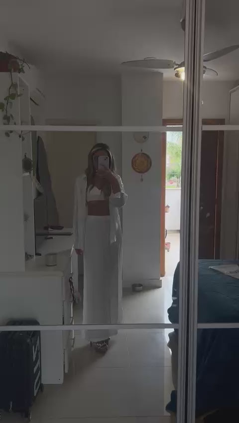 O conjunto inclui três peças versáteis: cropped com decote em V e elástico abaixo do busto, camisa oversized com caimento leve e calça pantalona de cintura alta e barra ampla. Um visual monocromático que transmite sofisticação com naturalidade.