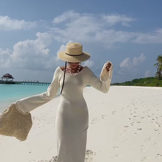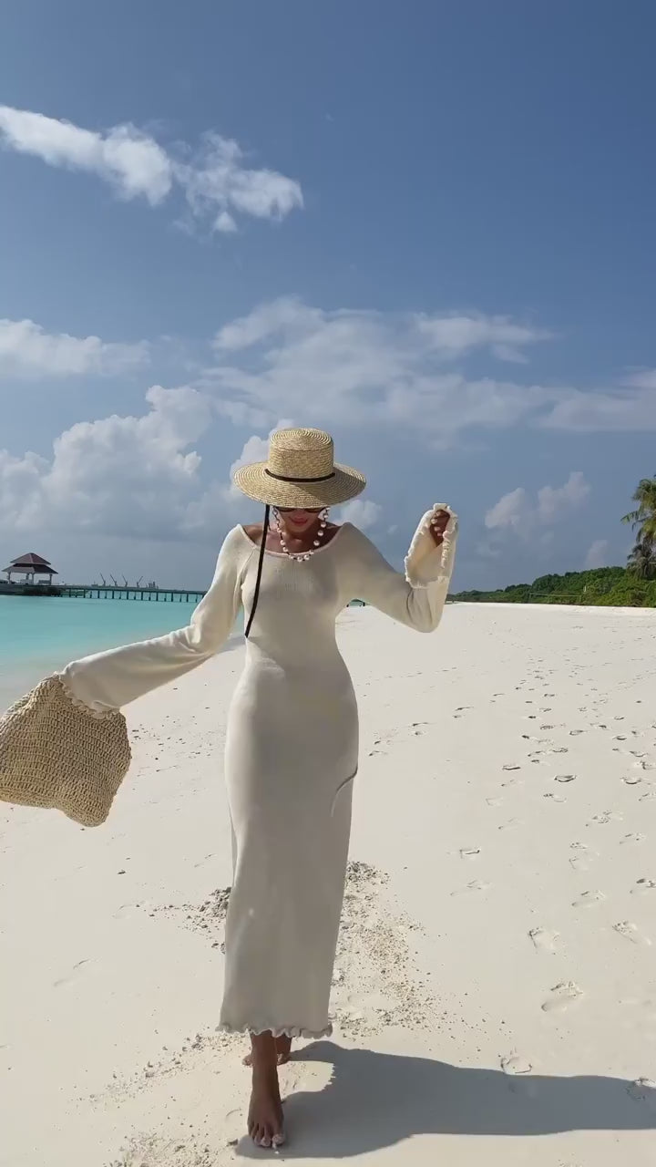 A Saida de Praia Tricô Vestido Longo Manga Longa se destaca pelo seu design e decotes barco, combinados com um ajuste slim fit e comprimento até o chão, criando uma silhueta elegante e sofisticada. Os recortes vazados adicionam um toque moderno e sensual.