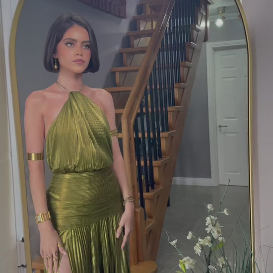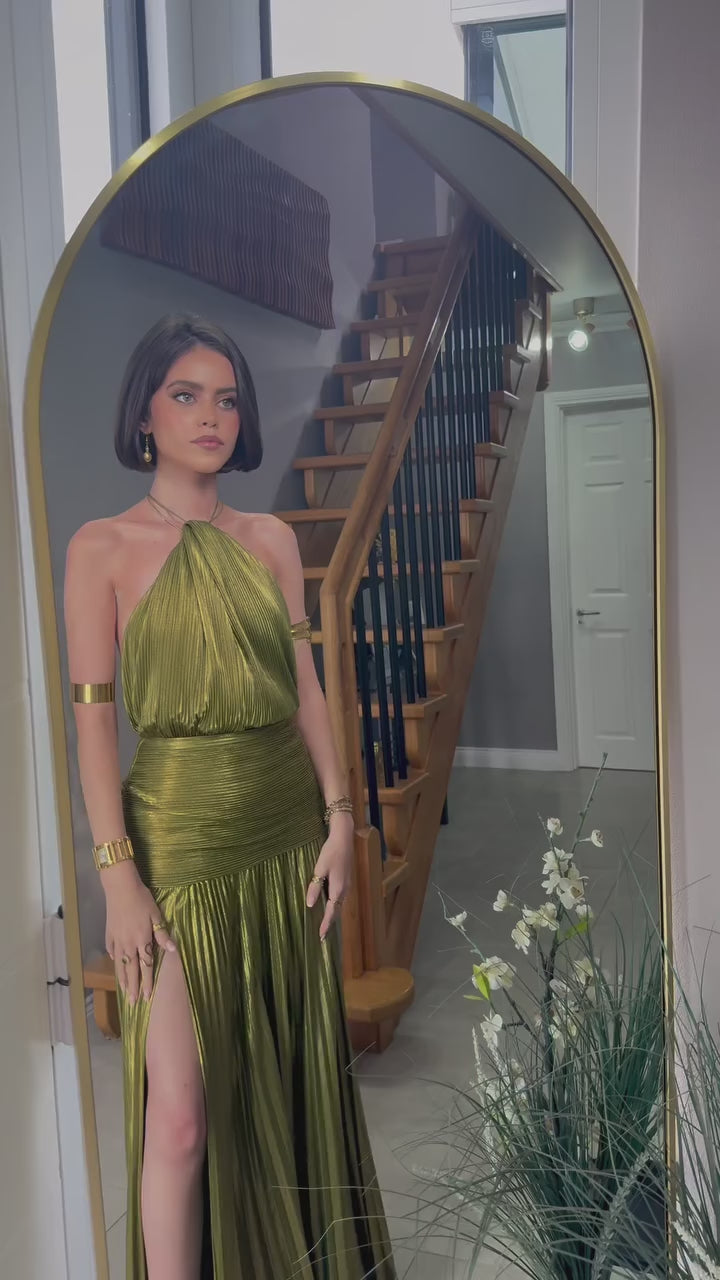 - Modelo: longo halter com saia plissada e fenda frontal alta