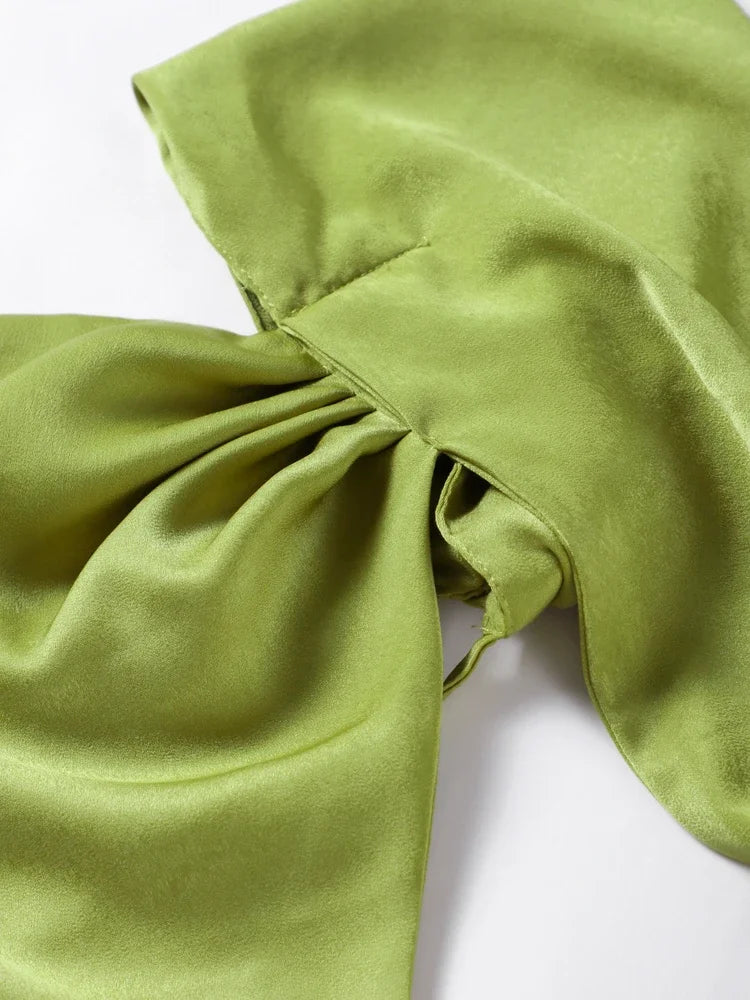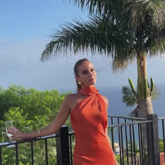O recorte de um ombro só e a cauda longa esvoaçante conferem um visual digno de tapete vermelho, enquanto o tecido leve valoriza a silhueta com caimento impecável. Disponível em cores vibrantes como verde, amarelo e laranja, cada tom intensifica o charme exclusivo da peça.