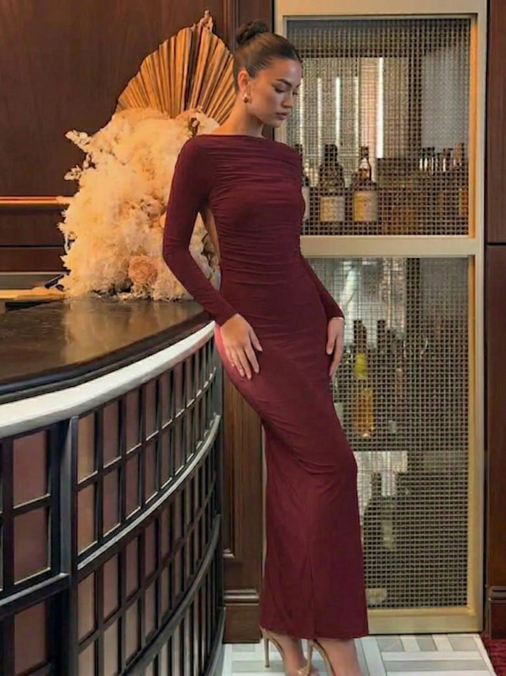 O detalhe franzido central nas costas cria um caimento impecável que destaca a silhueta com requinte. As mangas longas equilibram a sensualidade do decote profundo nas costas, trazendo uma estética glamourosa e impactante.