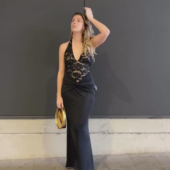 Elegante e sensual, o Vestido Longo Renda combina corpo em renda floral com decote profundo e saia lisa que alonga a silhueta — perfeito para noites especiais.